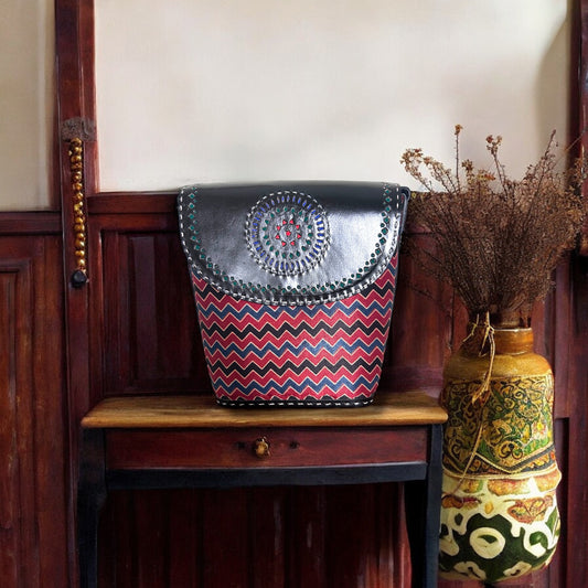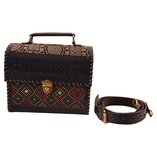 Umber Brown Embroidered Ajrakh Leather Bucket Bag