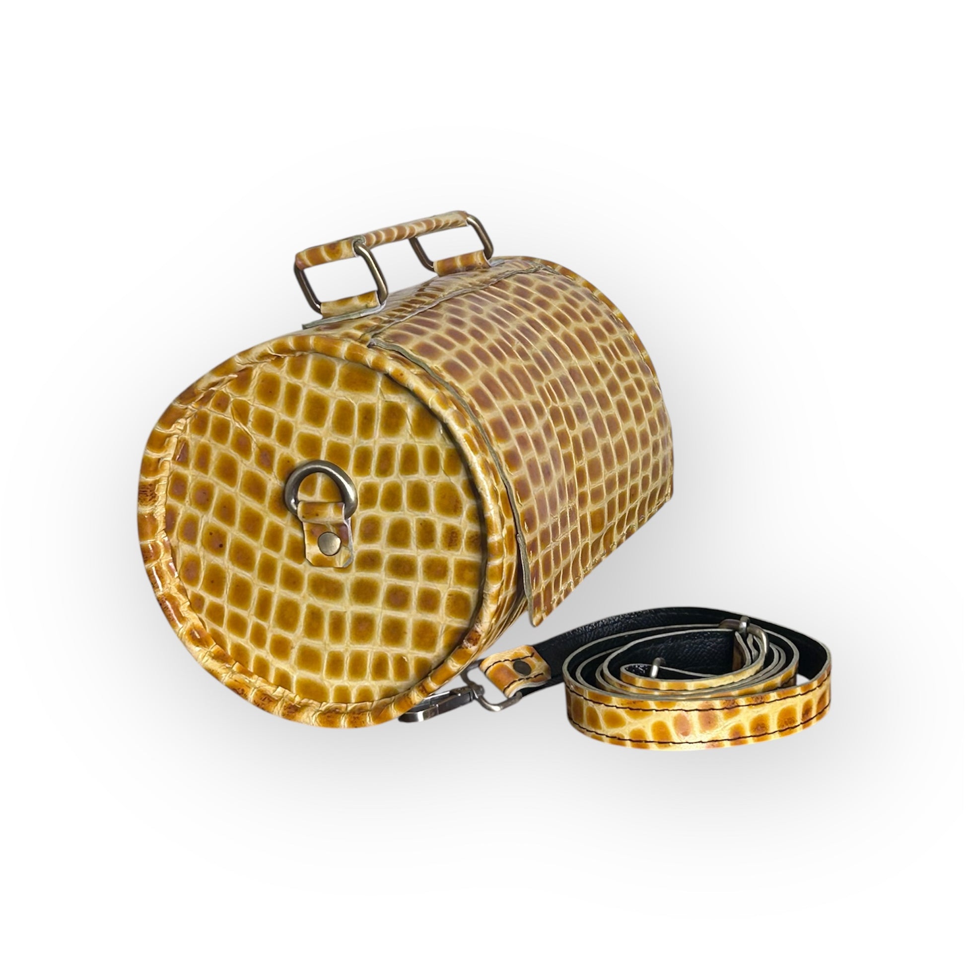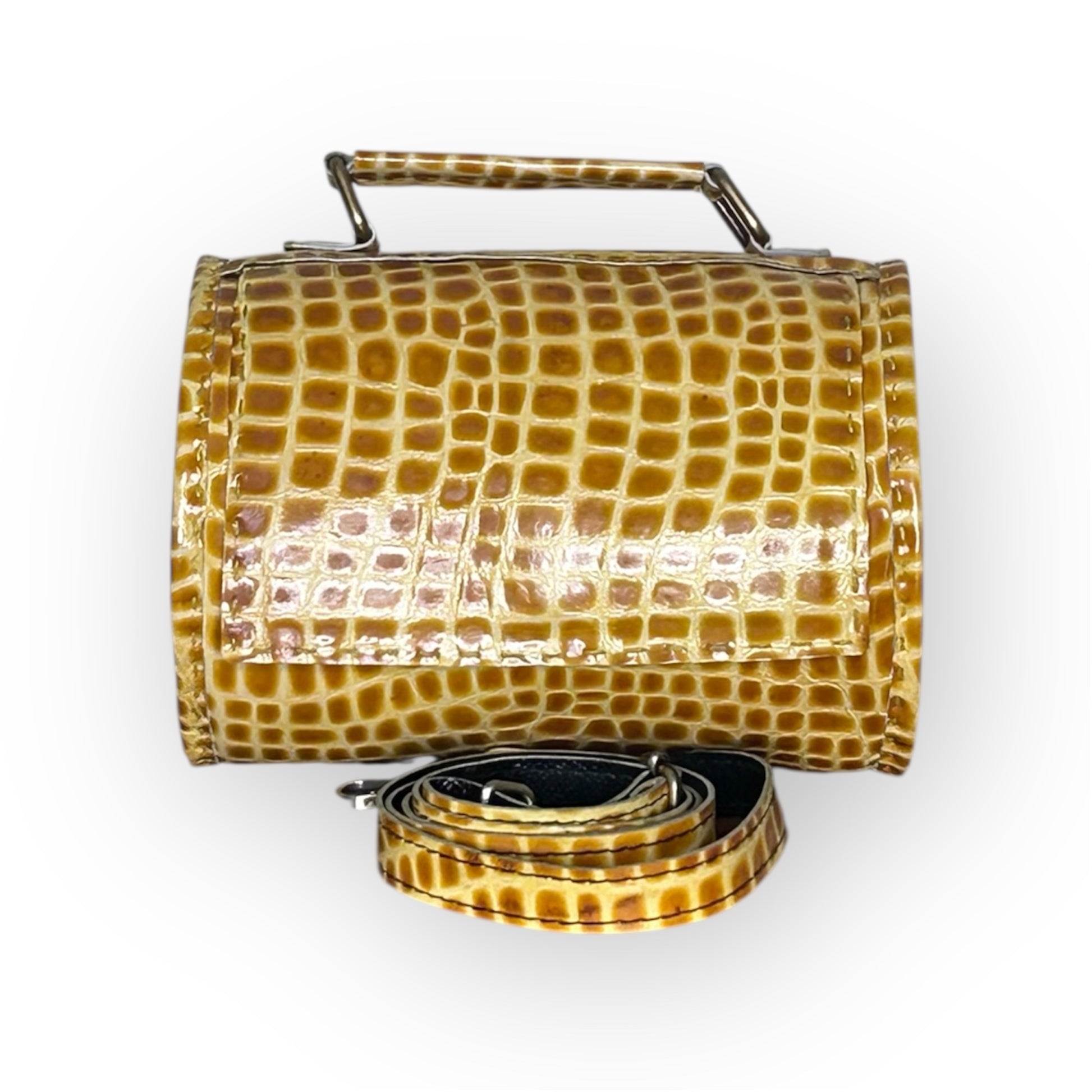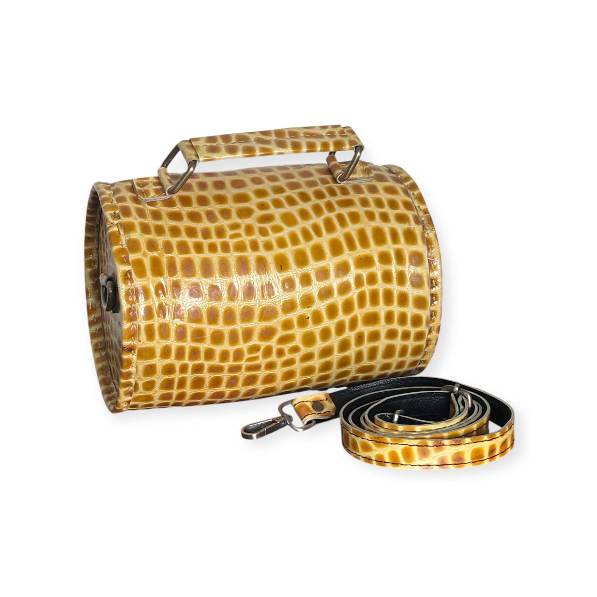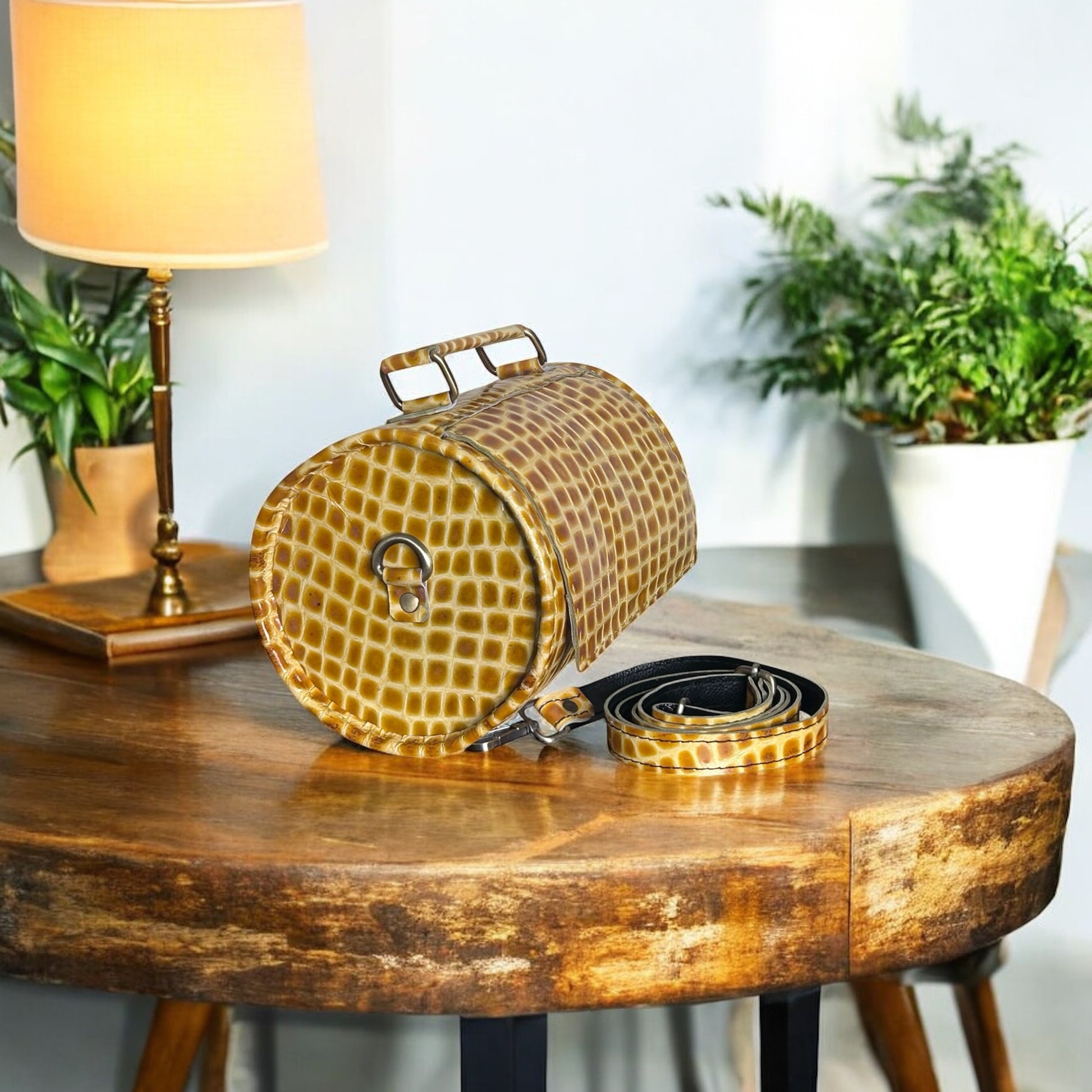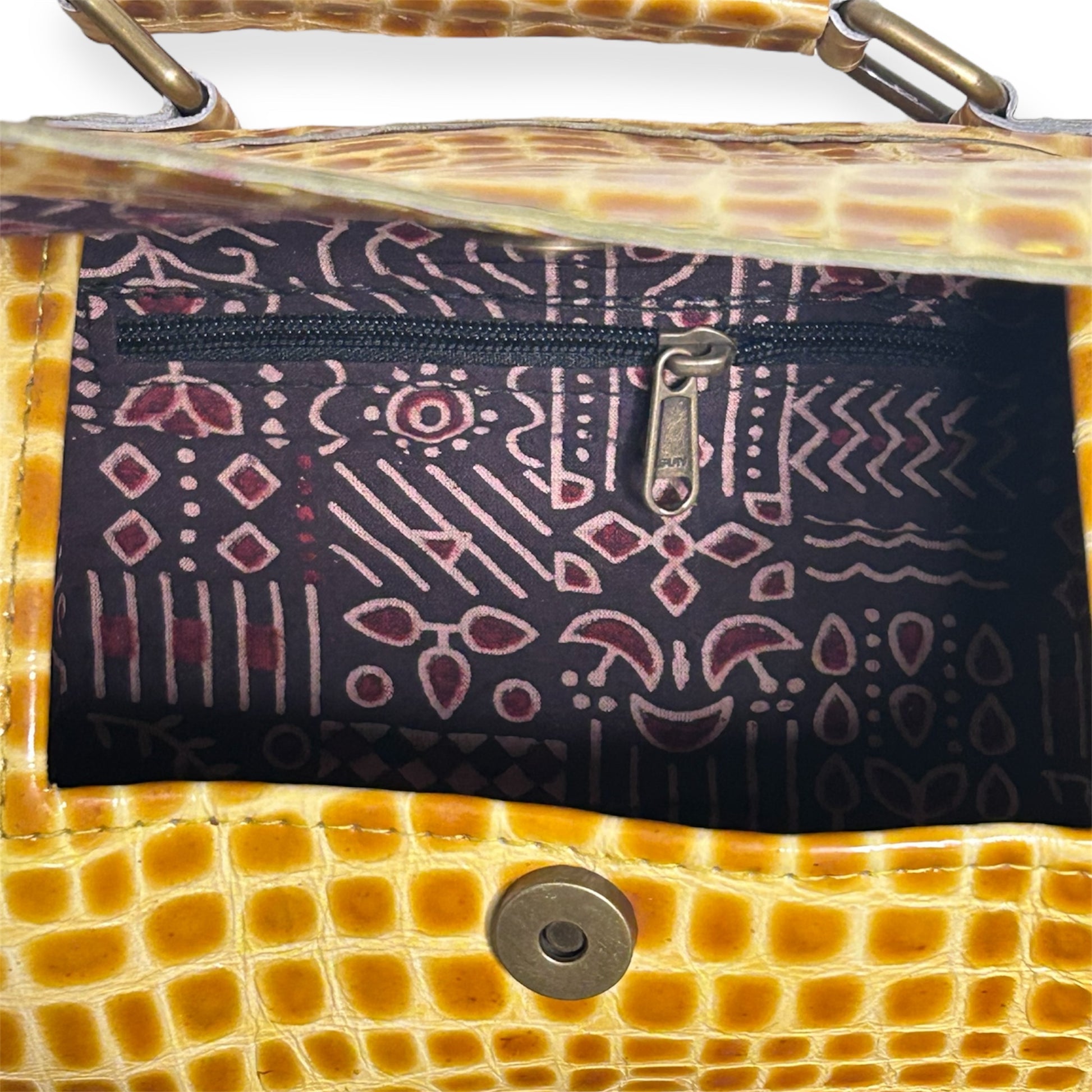 - The bag is cute and perfect for everyday wear. The beautiful Yellow-white croc leather with block printed ajrakh mashru lining on the inside giving the bag a classy and distinctive look.