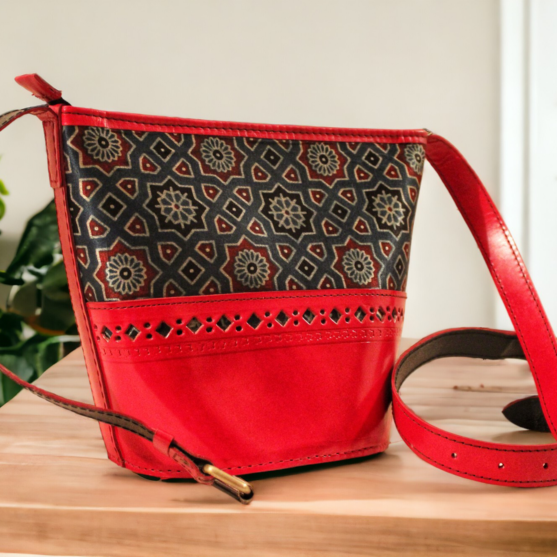 - The bag is cute and perfect for special occasions. The beautiful Blue with red ajrakh silk mashru print with red colored leather makes it special and distinctive.