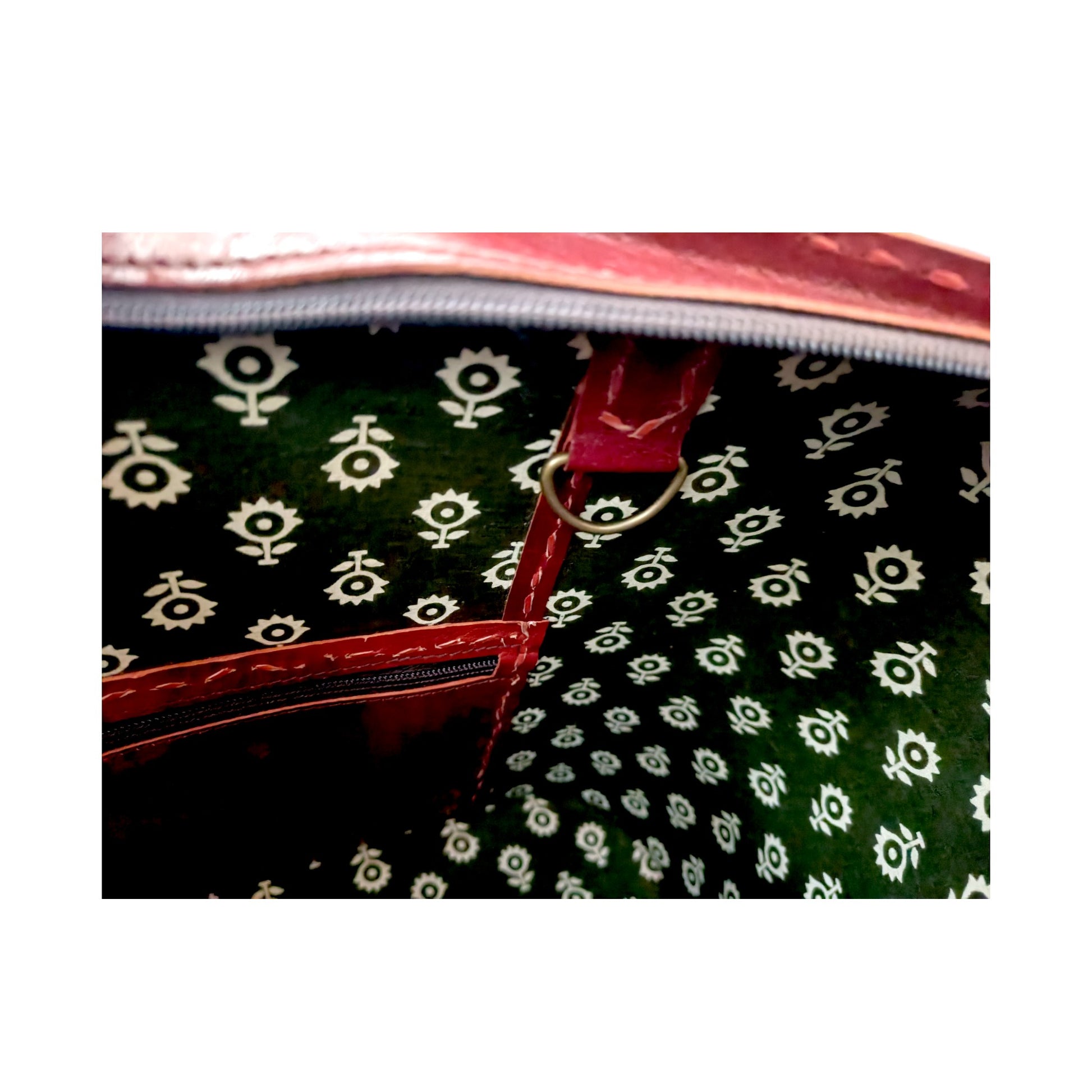 - One main compartment with side zipper pocket inside. It is lined with block printed cotton fabric.