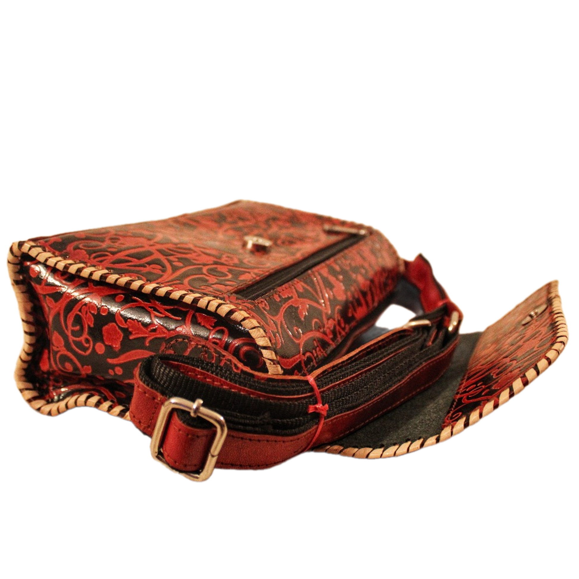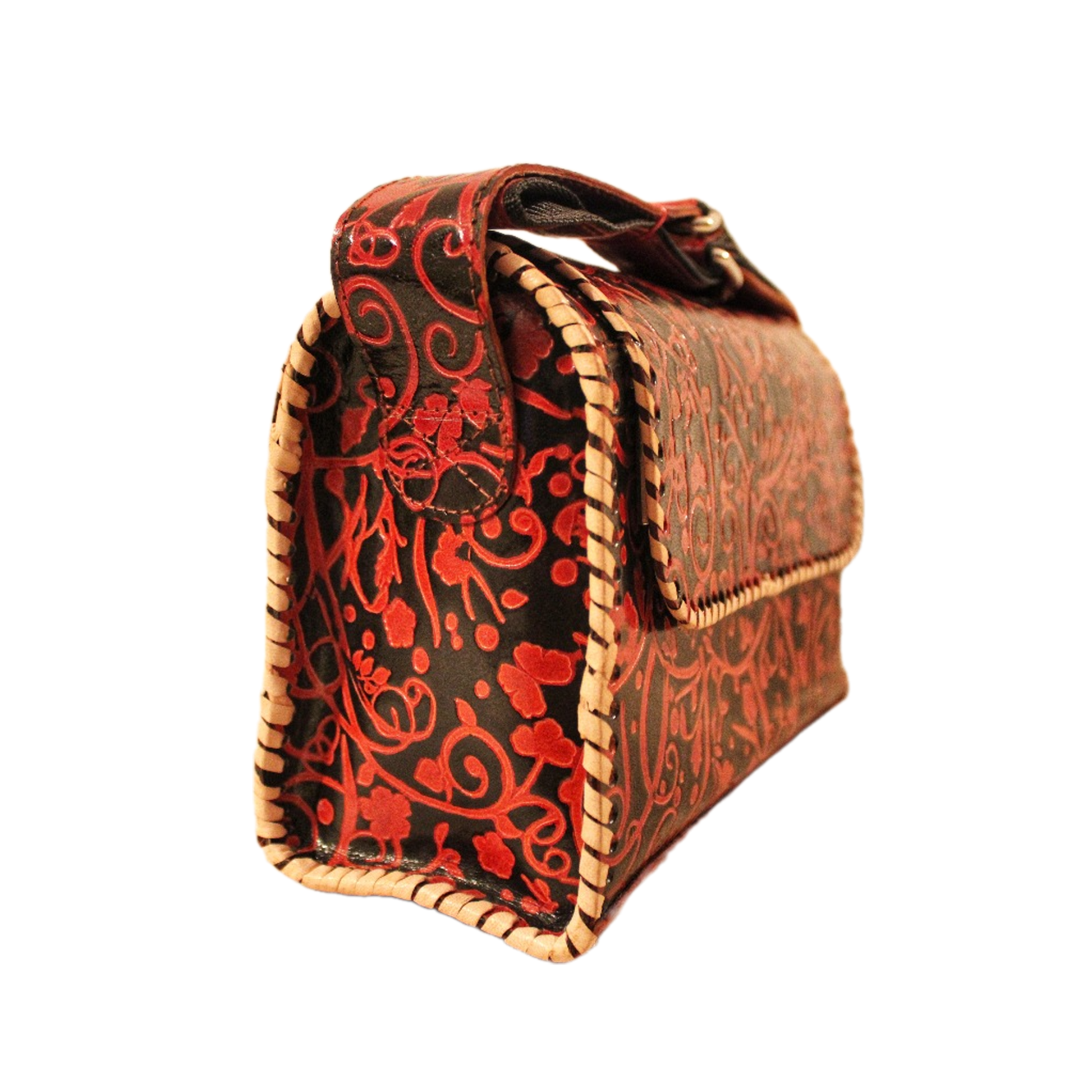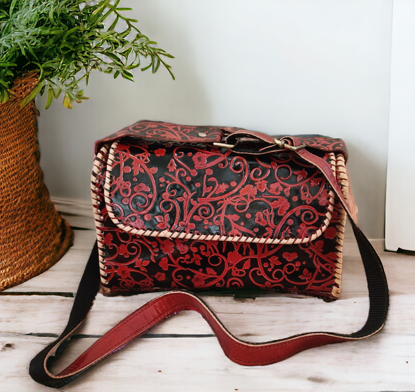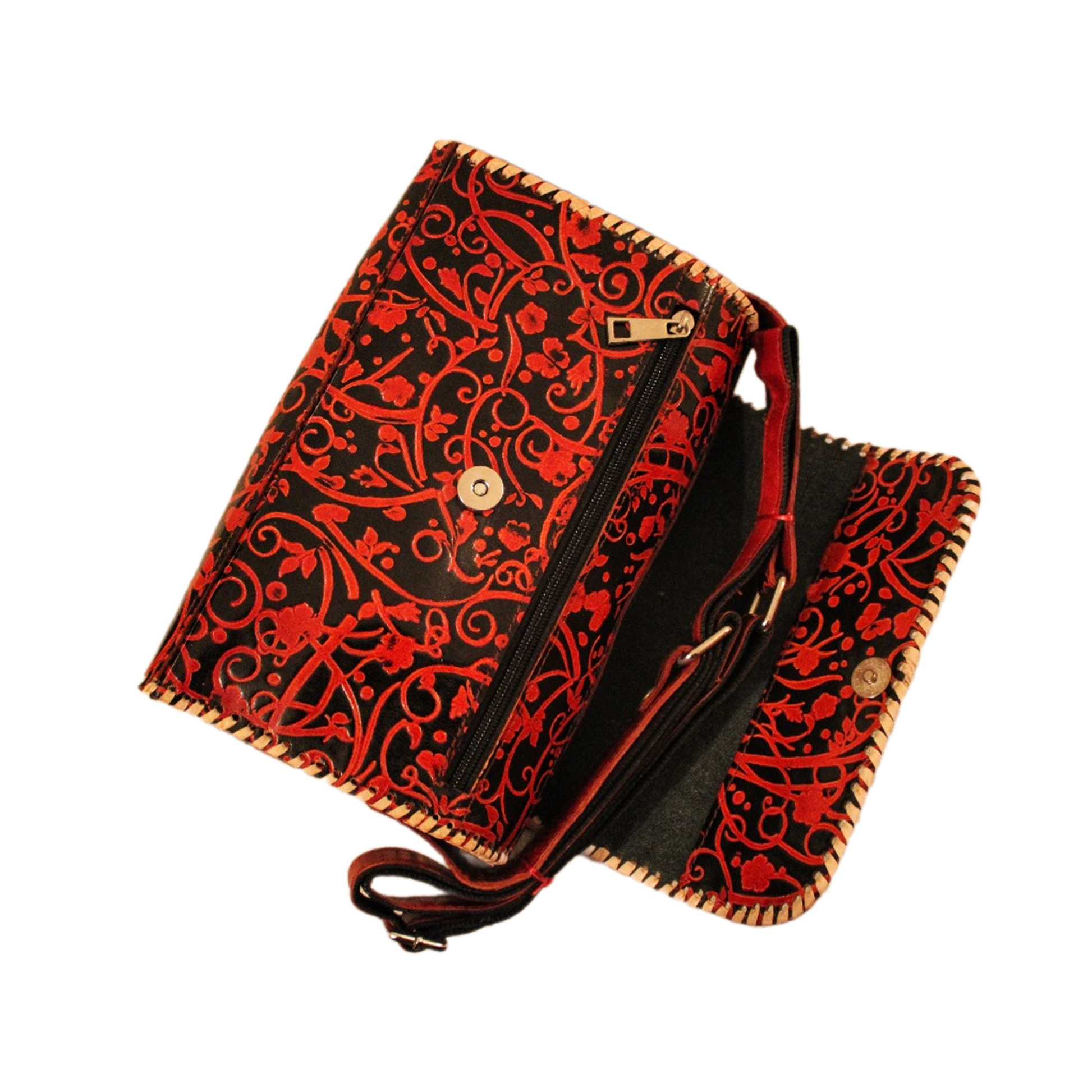 - The leather bag is endowed with intricate and beautiful embossed handwork in a color contrasting fashion. The bag is an epitome of the artisan's traditional skills which have been in practice for generations.