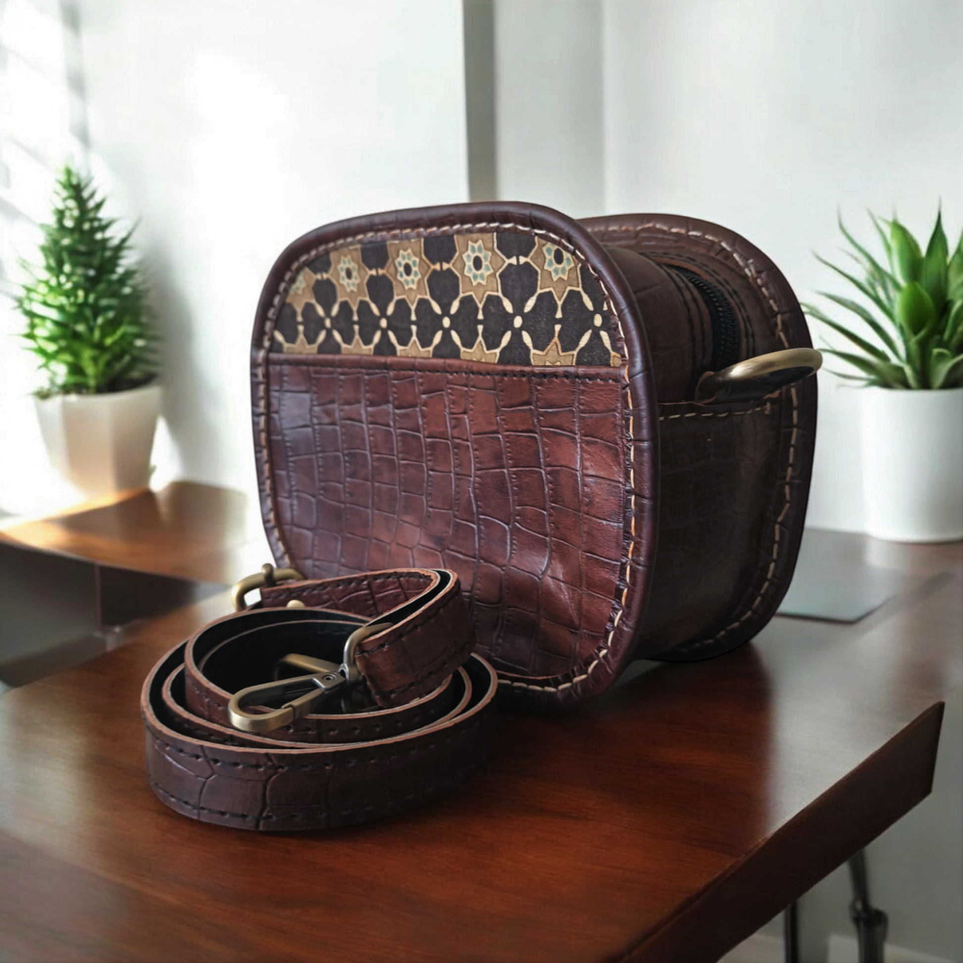 Chocolate Brown Leather Ajrakh Box Sling Bag