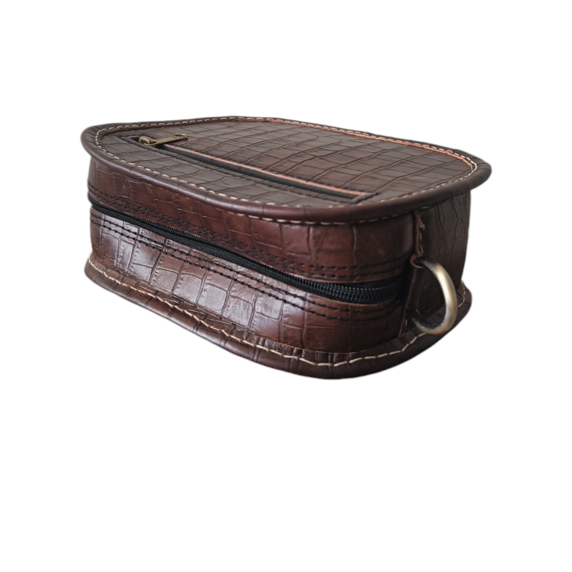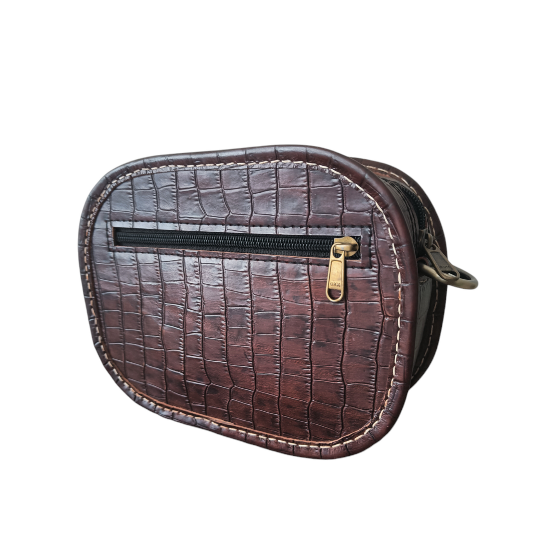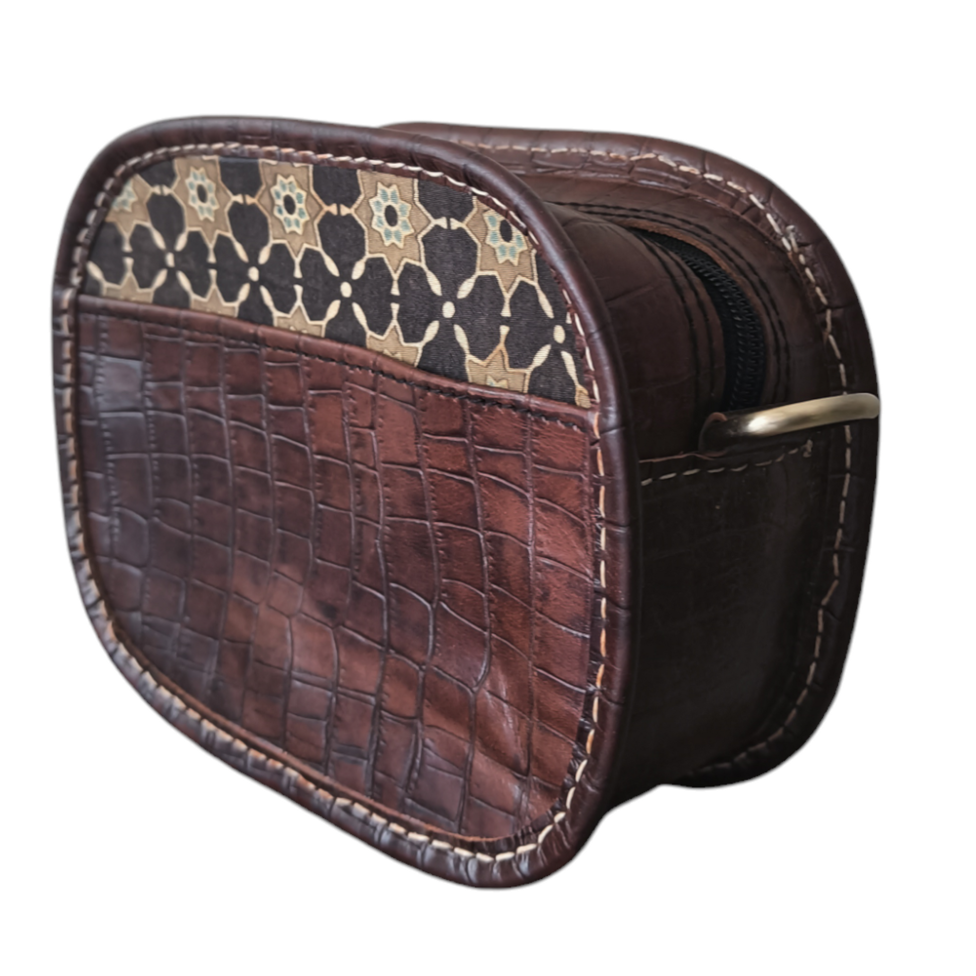 - The bag is cute and perfect for everyday wear. The beautiful Chocolate colored leather with ethnic printed ajrakh silk mashru print gives the bag a classy and distinctive look.