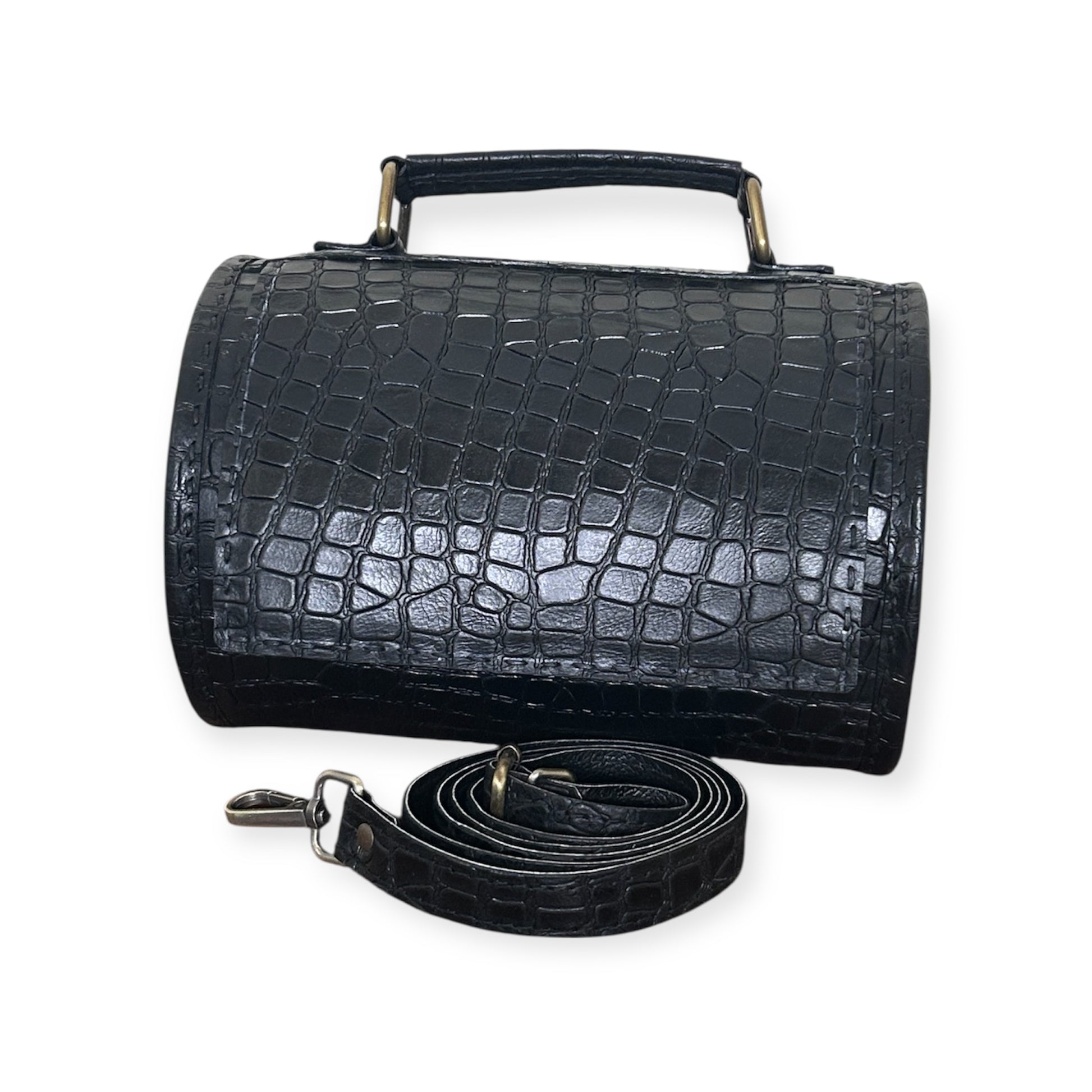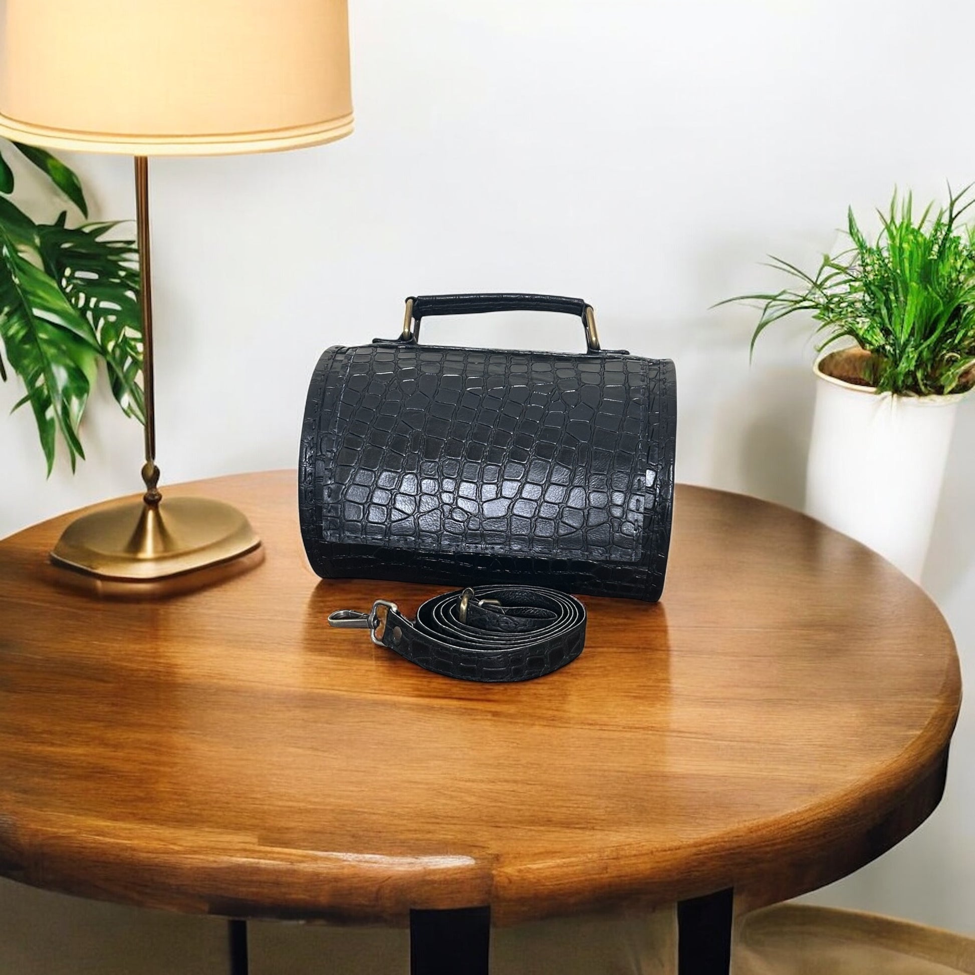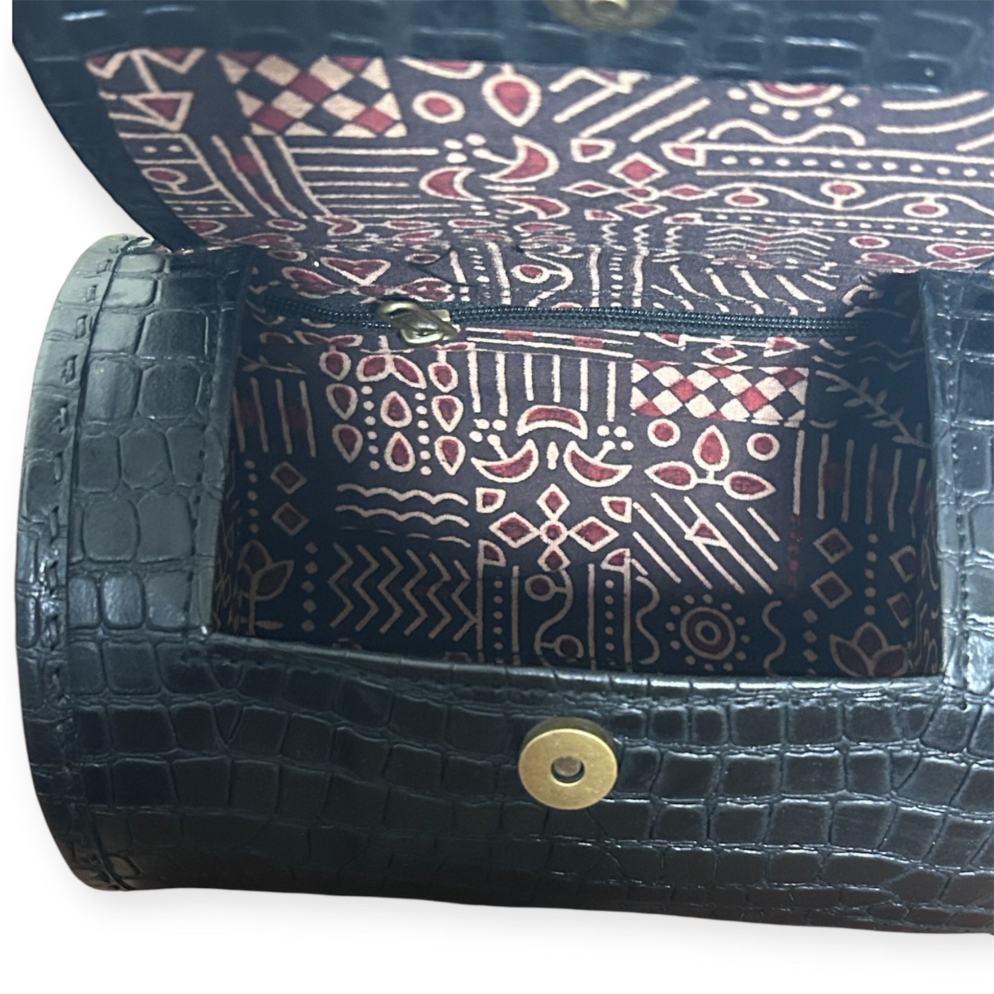 - The bag is cute and perfect for everyday wear. The beautiful black colored croc leather with block printed ajrakh mashru lining on the inside giving the bag a classy and distinctive look.