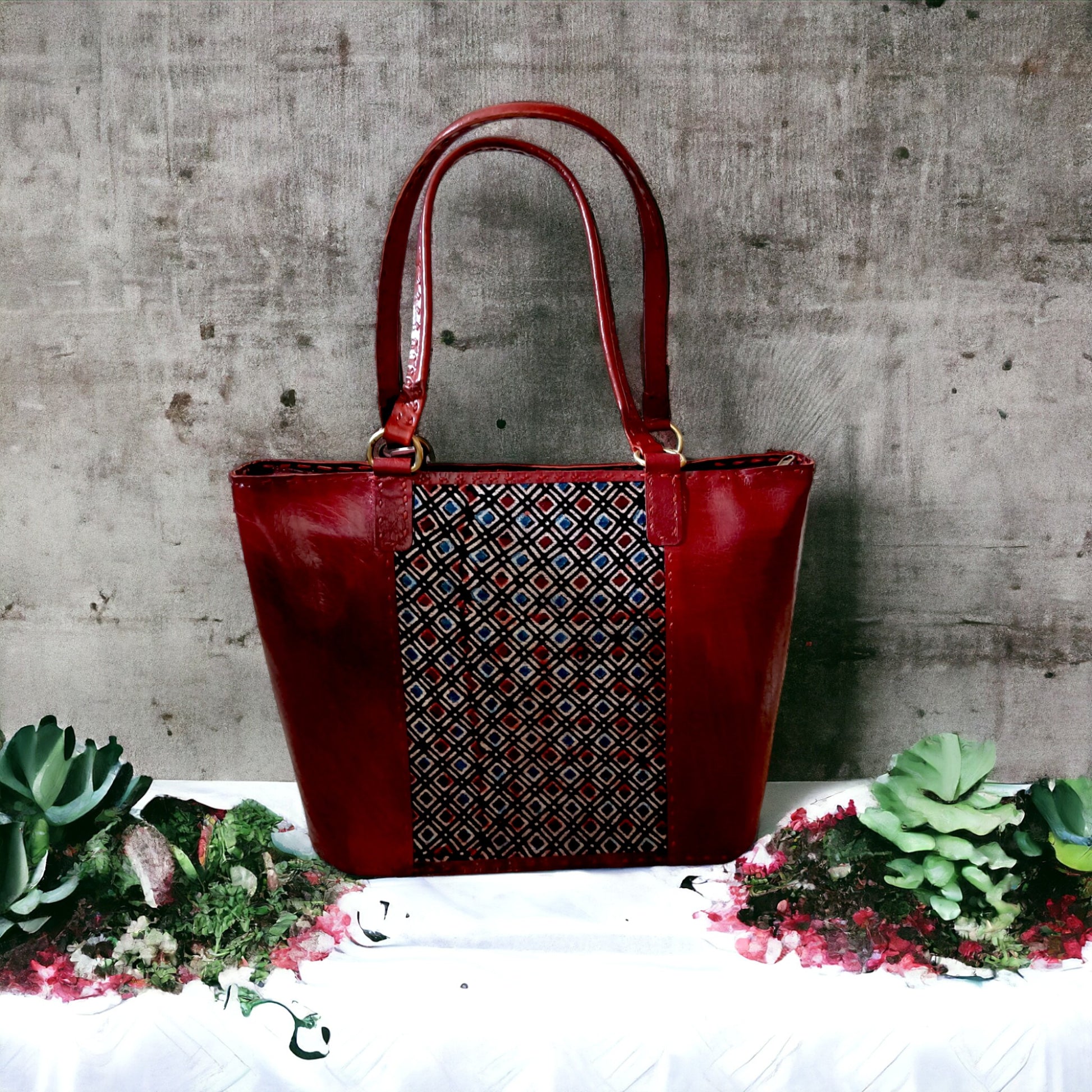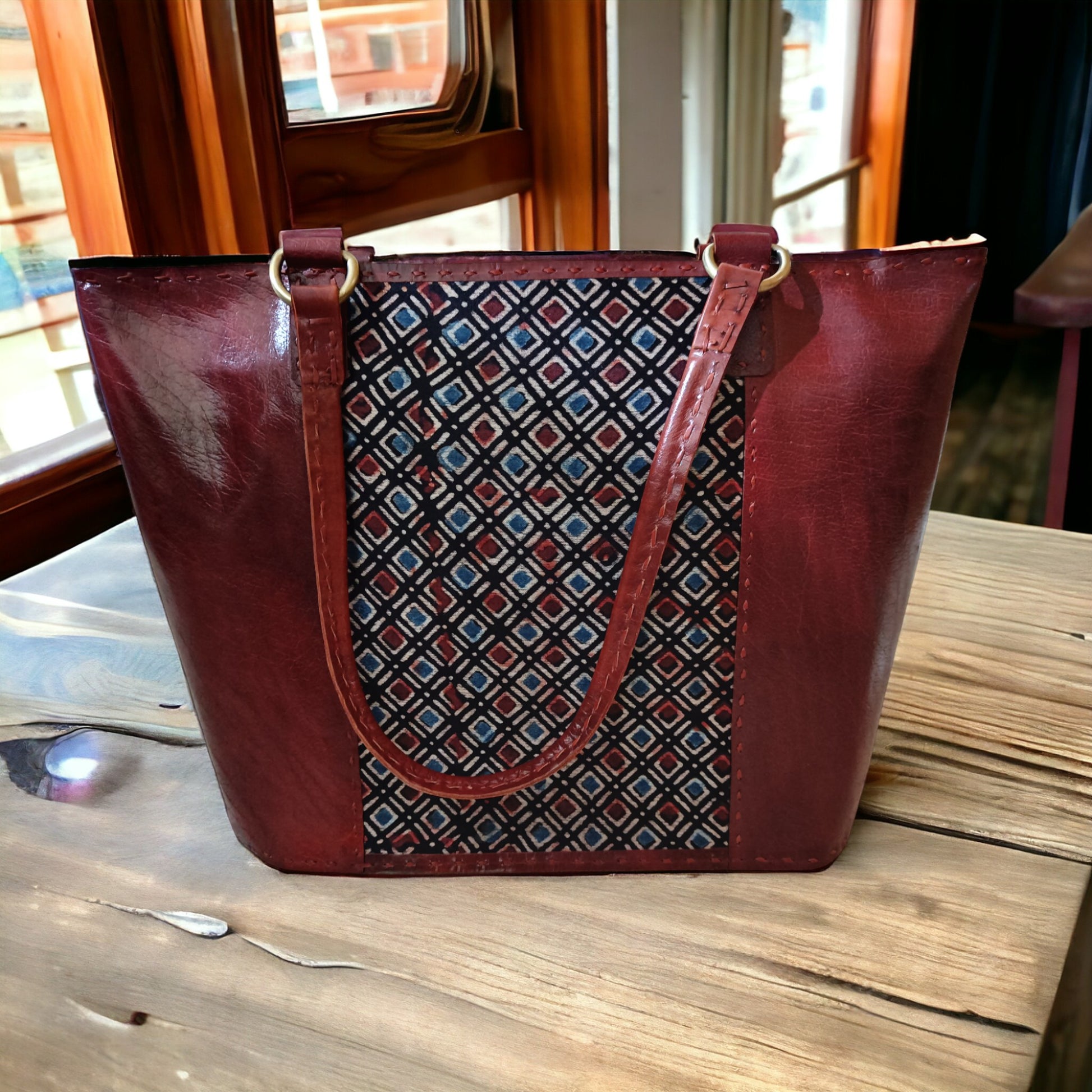 The bag is endowed with a stunning and classy Ajrakh Silk Mashru design on one side and made of pure leather.