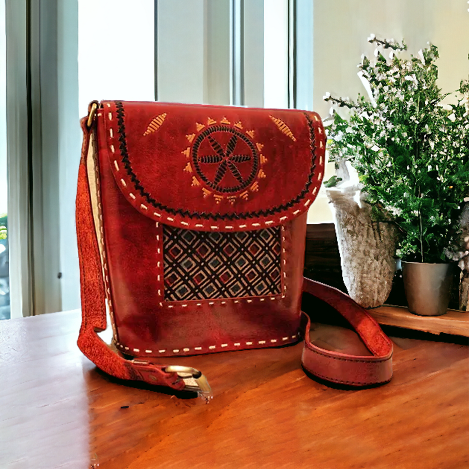 The leather bag is endowed with a stunning and classy Ajrakh silk Mashru Patch at the centre and the flap of the bag is endowed with leather strip embroidery.